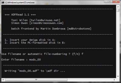 use this batch frontend with adfread if you have a number of amiga disks to be transferred to your windows machine to ease the process. you can use the .adf disk images with an emulator like winuae then. since reading amiga disks sector-by-sector on pc takes some time, the frontend supports overwrite protection of your already done diks images and automatic numbering if you can not read the labeling due to their aGE :) |